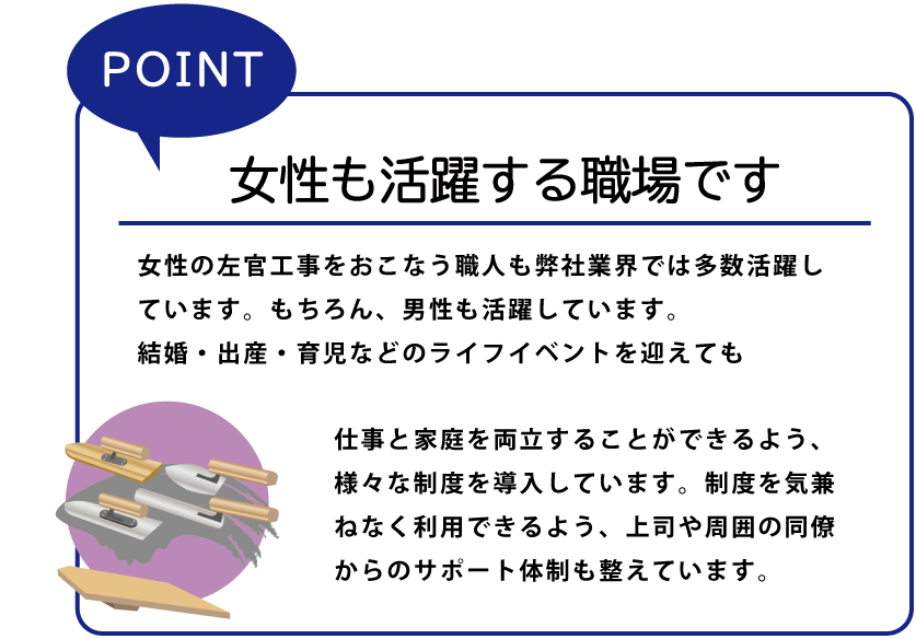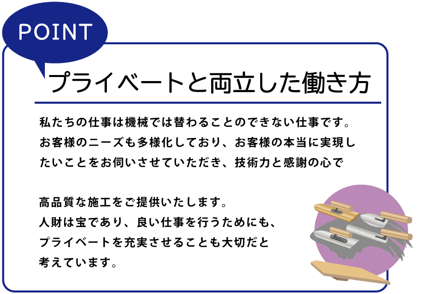| 仕事内容 | 神社・新築アパート・注文住宅・店舗・カフェで左官工事を行います。 |